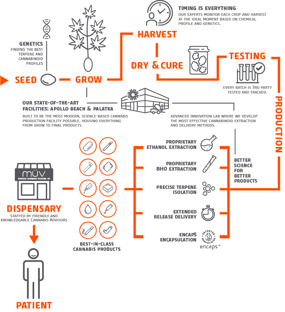 We're dedicated to providing the best to Florida's patients, from seed to sale. It starts with the best genetics, identified by their cannabinoid and terpene profiles. Each strain is grown in our state-of-the-art facilities located in Apollo Beach and Palatka, built to be the most modern, science-based cannabis production facilities possible, housing everything from growing plants to final products.