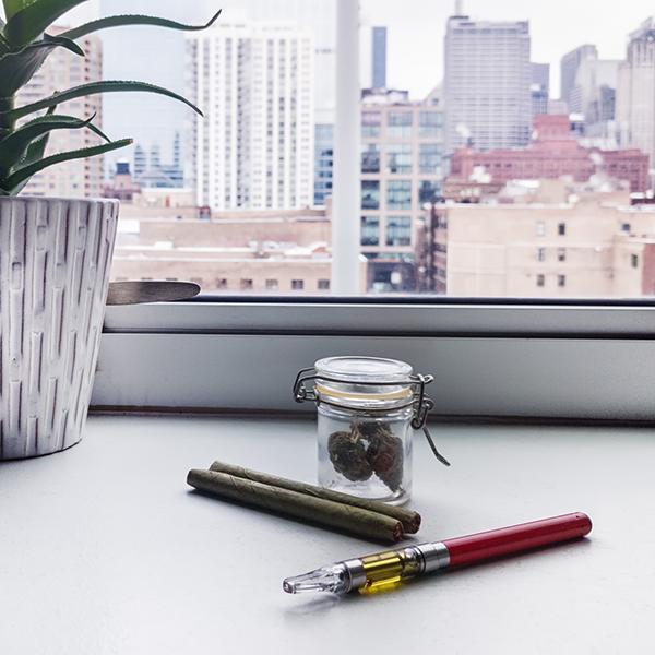 Vape pen, cigars and marijuana in a jar on a counter near a window. Smoking marijuana, smoking CBD oil vape juice. Tetrahydrocannabinol, THC.